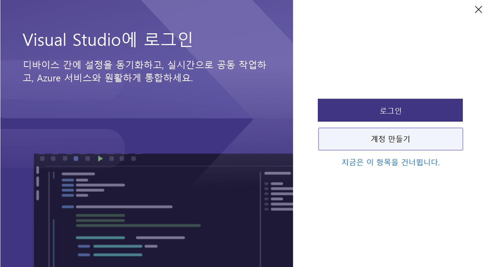 Visual Studio는 Microsoft 계정과 연동되어 있기 때문에, 로그인 화면이 나옵니다. 본인의 계정으로 로그인합니다. 당장 진행하지 않고 건너뛰어도 무방합니다.