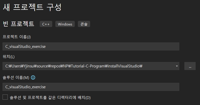 위에서 생성한 프로젝트 안에, C_visualStudio_exercise2.c 코드를 생성하고, 실행합니다.