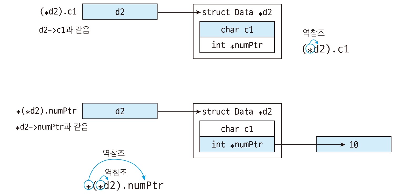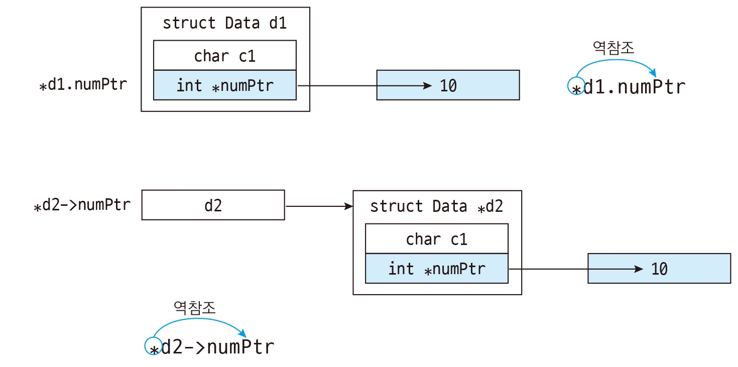 구조체 변수 d1의 멤버 numPtr을 역참조 하는 방법과 구조체 포인터 d2의 멤버 numPtr을 역참조 하는 방법을 그림으로 표현하면 다음과 같은 모양이 됩니다.