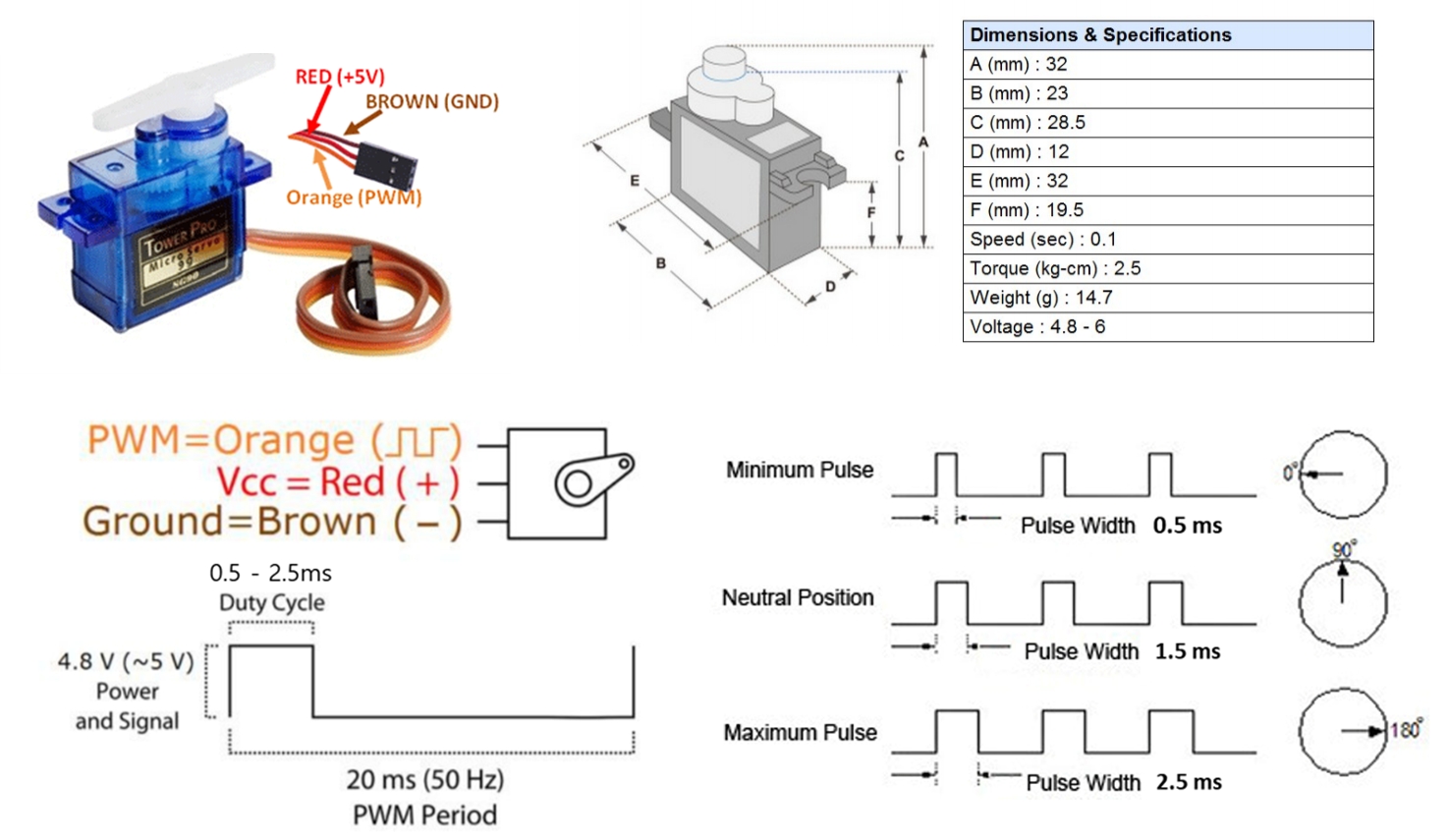 An RC servo motor is a tiny and light weight motor with high output power. It is used to control rotation angles, approximately 180 degrees (90 degrees in each direction) and commonly applied in RC car, and Small-scaled robots. The angle of the motor can be controlled by the pulse width (duty ratio) of PWM signal. The PWM period should be set at 20ms or 50Hz. Refer to the datasheet of the RC servo motor for detailed specifications.
