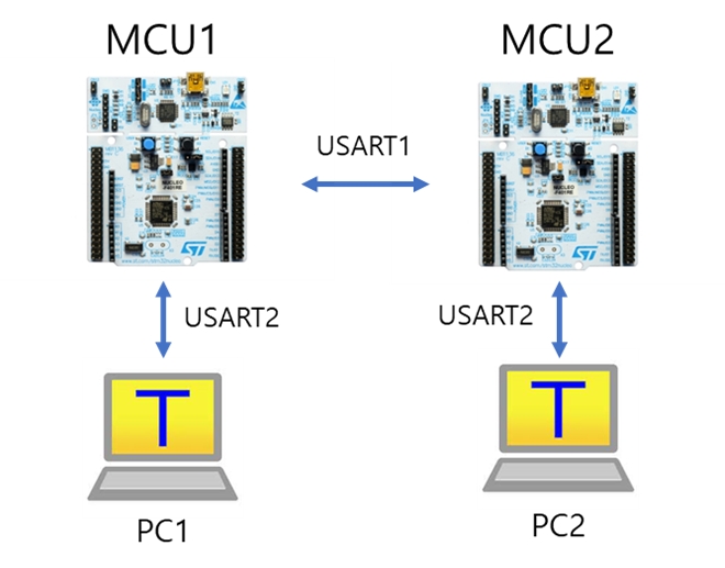 4. Connect MCU1 to MCU2 with USART 1