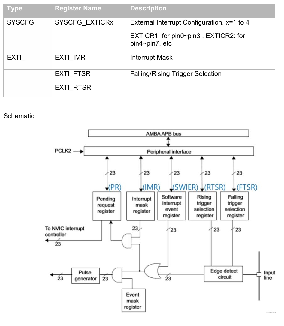 List of external interrupt (EXTI) registers used in this tutorial [Reference Manual ch7, ch10.2]