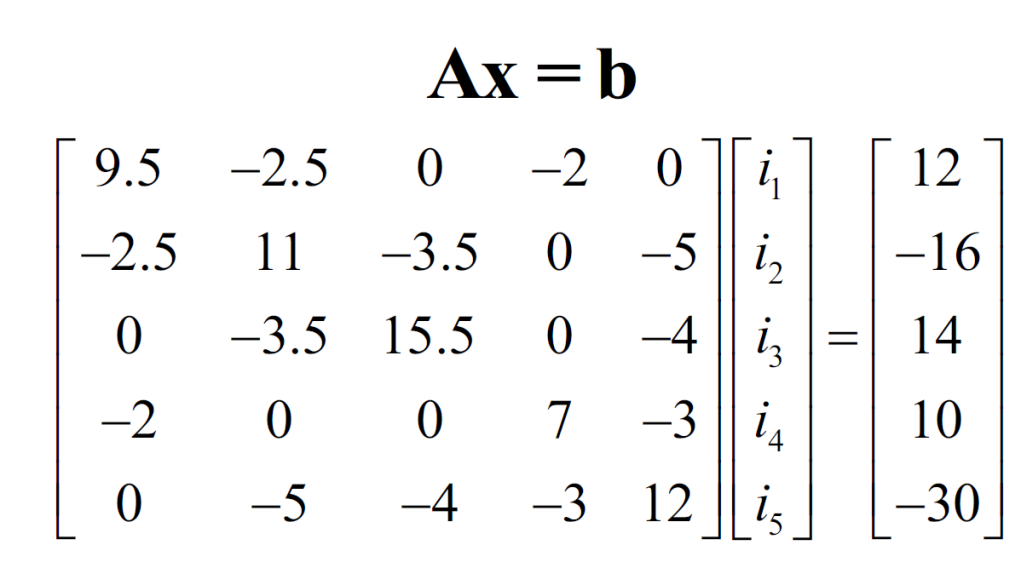 A=[9.5, -2.5, 0, -2, 0;     -2.5, 11, -3.5, 0, -5;     0,-3.5, 15.5, 0, -4;     -2,  0,  0, 7, -3;     0, -5,  -4, -3, 12];