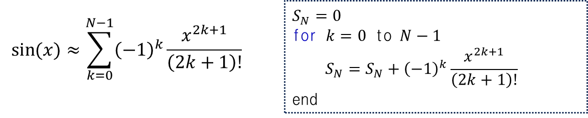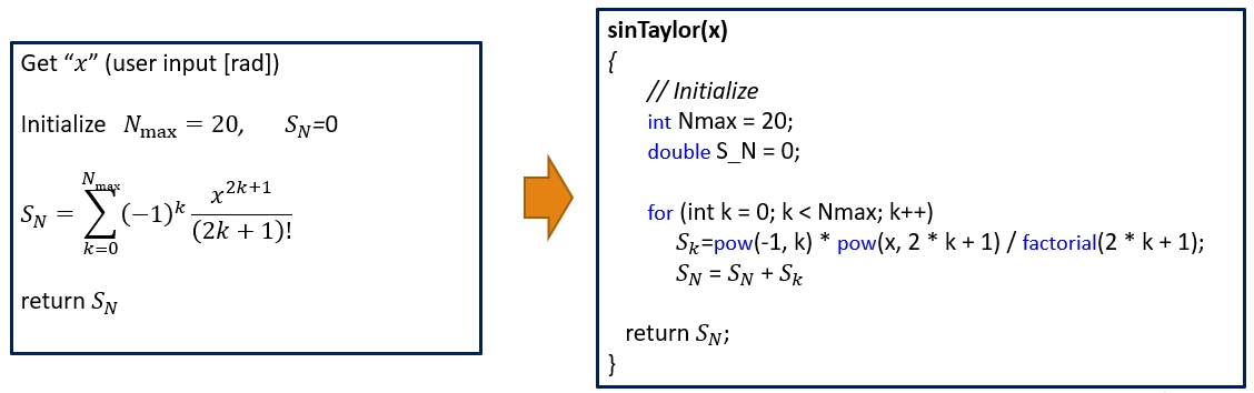 // Taylor series approximation for sin(x) using pre-defined functions (input unit: [rad])
