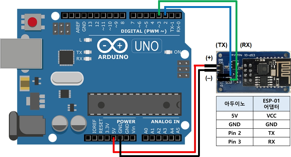 아두이노(Arduino) 인터넷 연결하기: ESP-01(ESP8266) 와이파이 모듈(Wifi module) 어댑터 배선 \