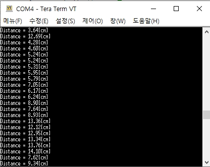 Press the reset button(black) and verify the operation. The distance between ultrasonic sensor and obstacle will be shown in Tera Term.