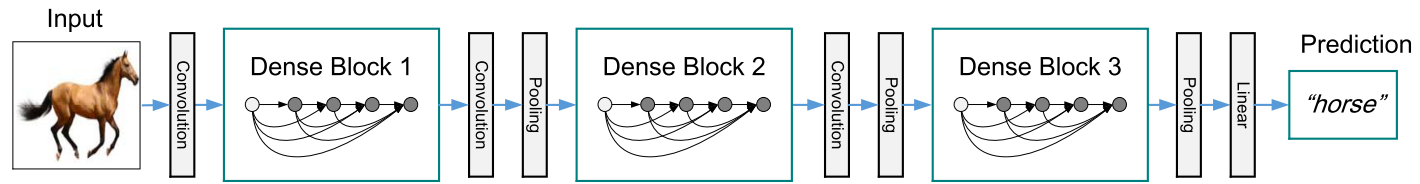Huang et al. [9] proposed a novel architecture called DenseNet that further exploits the effects of shortcut connections — it connects all layers directly with each other. In this novel architecture, the input of each layer consists of the feature maps of all earlier layer, and its output is passed to each subsequent layer. The feature maps are aggregated with depth-concatenation.