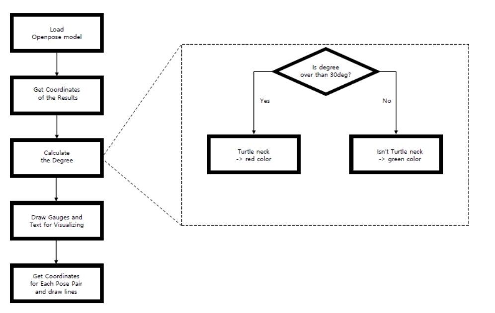 Because of increasing usage of smartphones and computers, forward head posture is severe in modern young people. But actually by correcting their posture, it can be easily cured. And if you know your current posture, it is naturally followed by correcting posture. So we designed this program to visualize subject's posture by using OpenPose. OpenPose works best at Nvidia GPU environment.