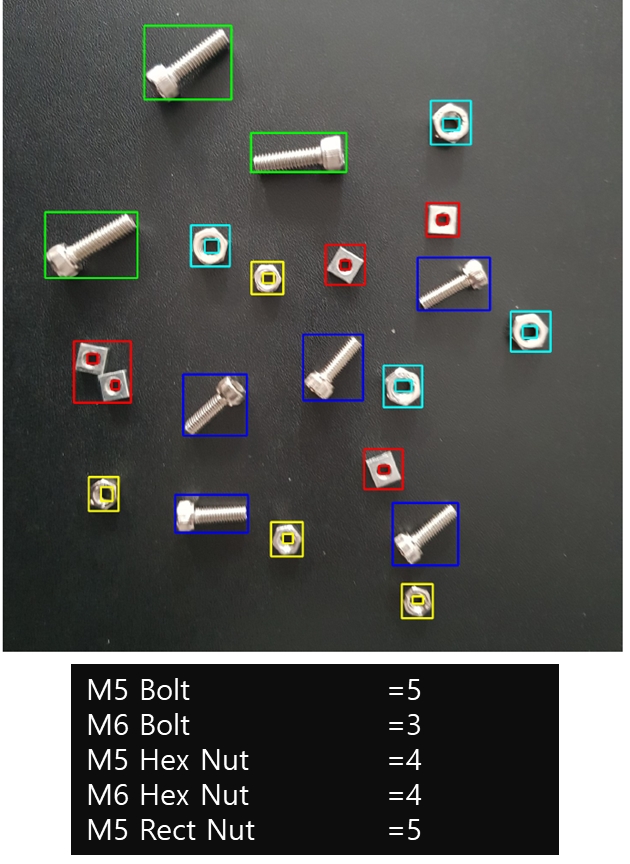 The result of mechanical part segmentation is shown with contour boxes in Figure 00. Also, the counting output of each nut and bolts are shown in Figure 00.