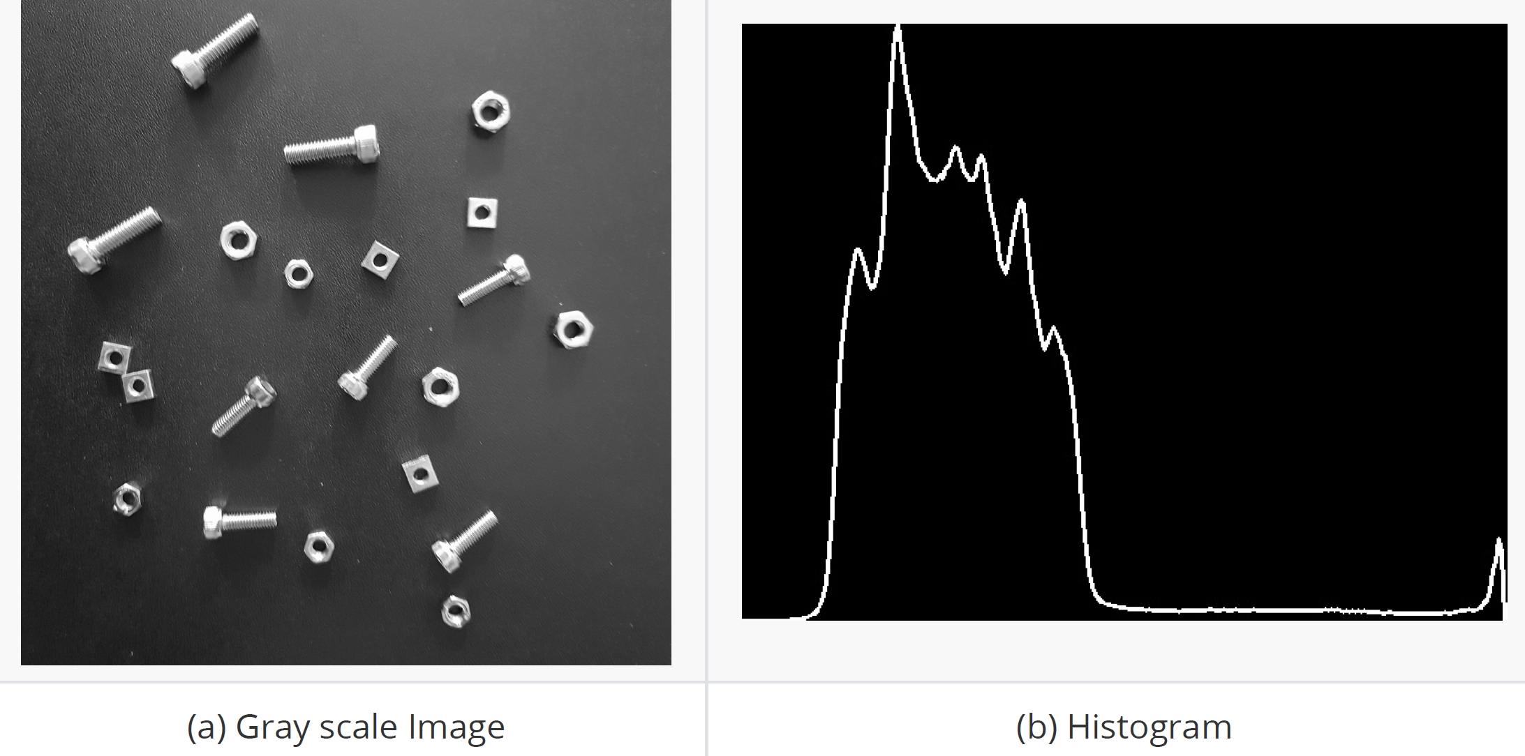 The input image is analyzed with a histogram to understand the distribution of intensity values. As seen in the histogram in Figure 1(b), the bright component of objects can be segmented from mostly dark backgrounds.
