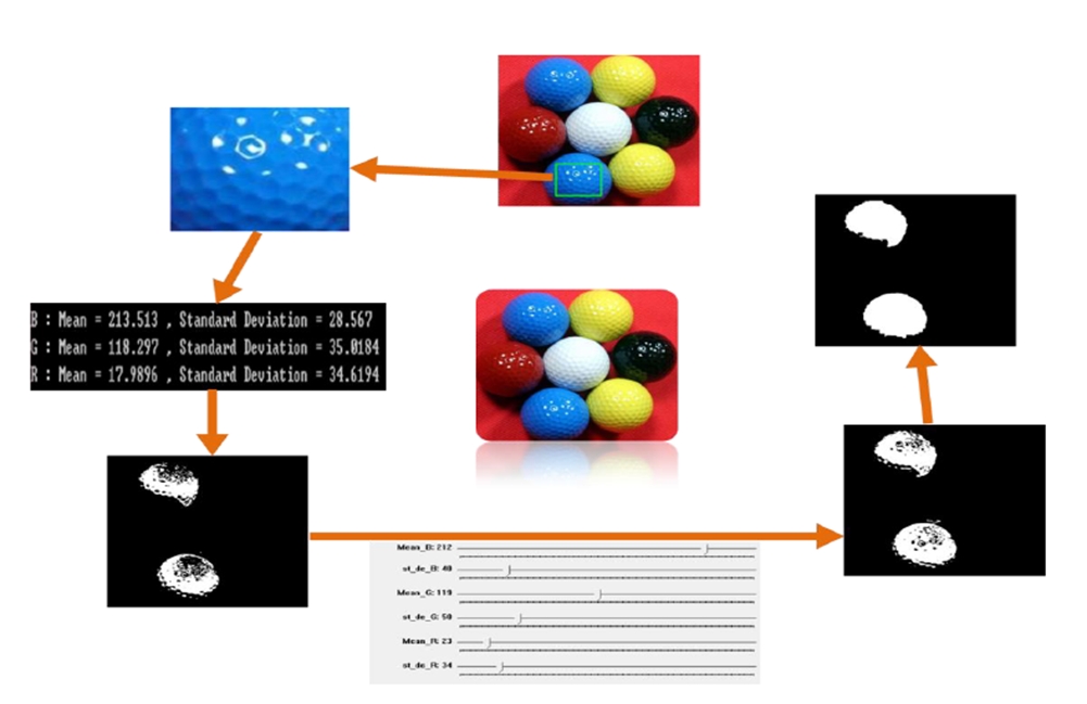 Add slidebars to change the InRange values of each R, G, B or H, S, V and segment each colored ball.