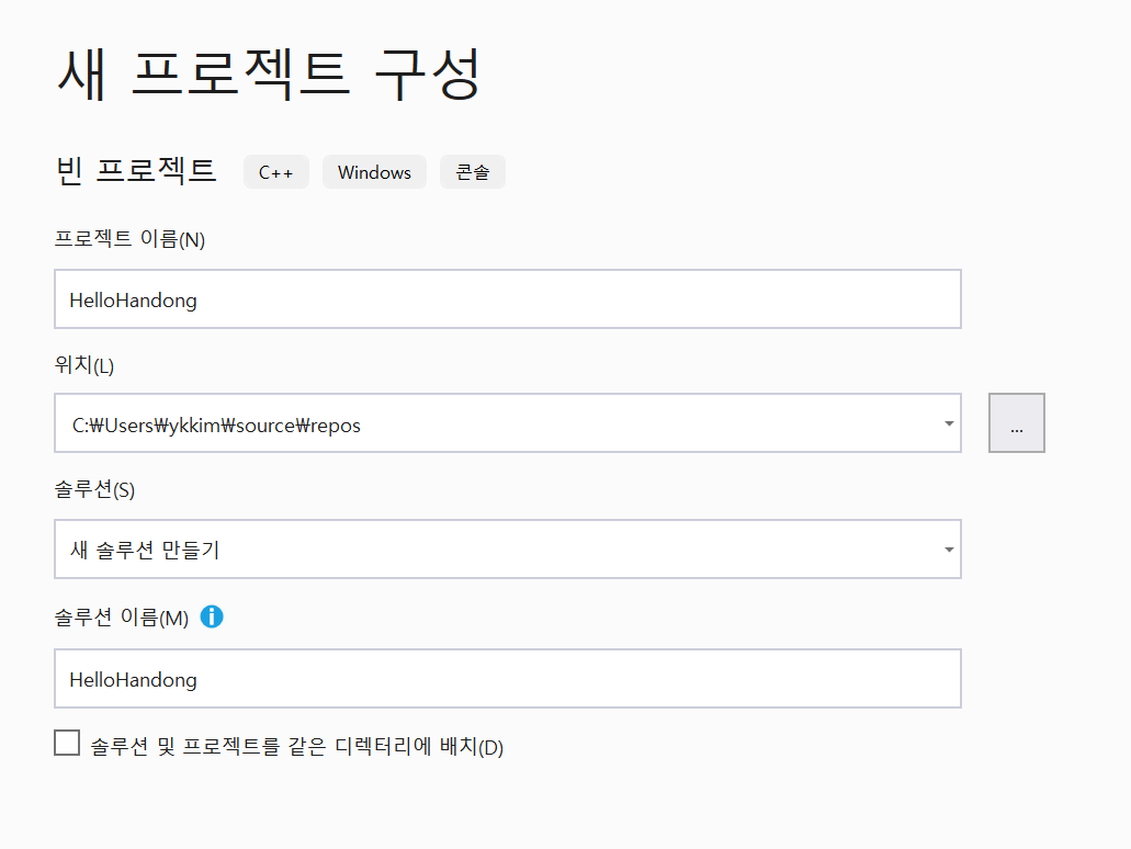 νλ‘μ νΈ μ΄λ¦μ HelloHandong μΌλ‘ μ€μ ν λ§λ€κΈ°