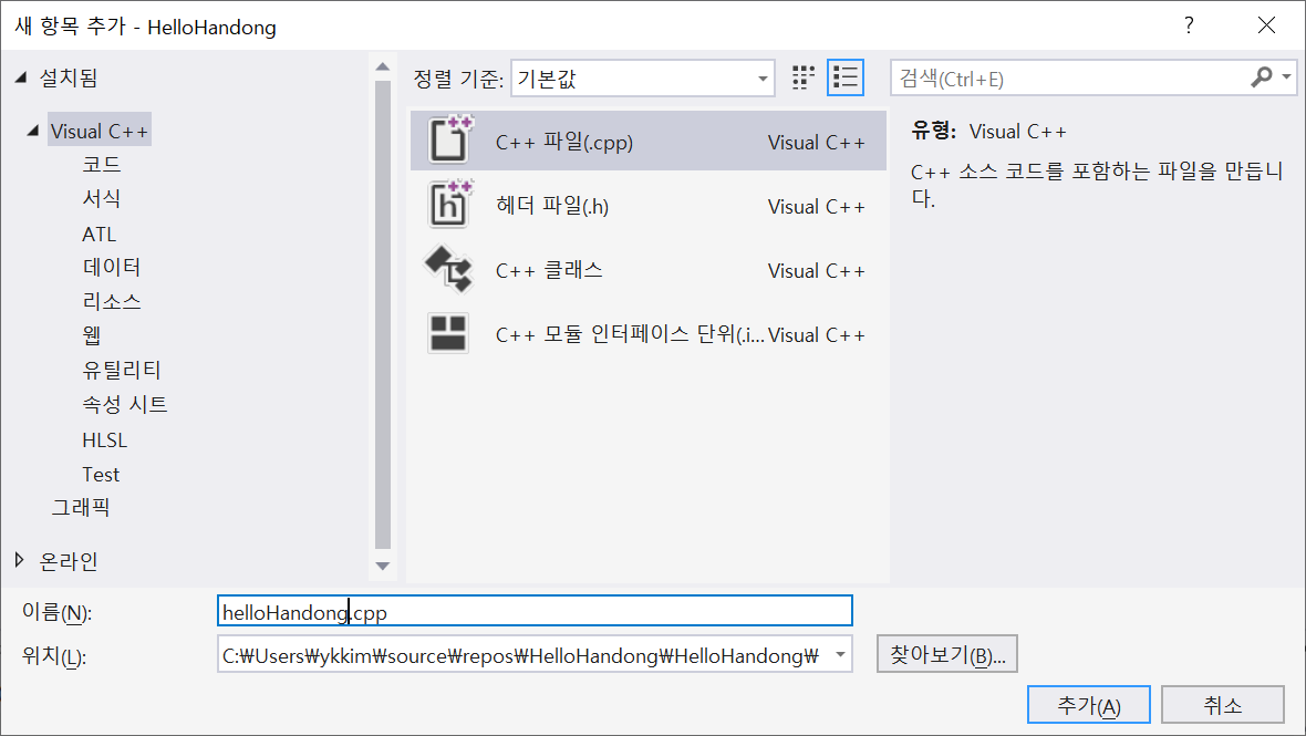 C++ νμΌ(cpp) μ ν ν helloHandong.cpp νμΌ μμ±