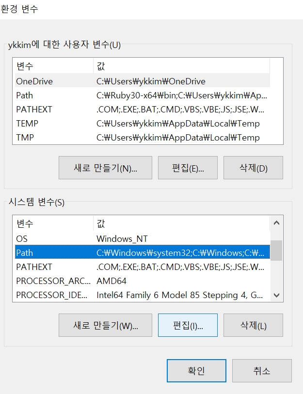 ‘시스템 변수’ 항목에 있는 변수 명 중 ‘**Path’**를 찾아 편집