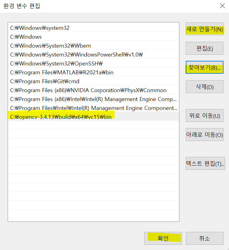 새로 만들기 > 찾아보기 > C:\opencv-3.4.13\build\x64\vc15\bin 선택
