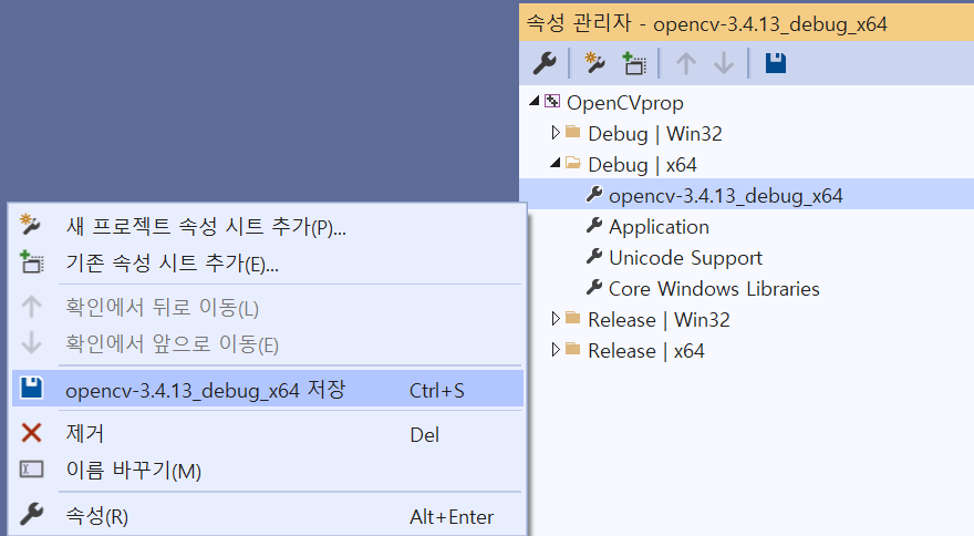 속성 관리자 창 > OpenCVprop > Debug|x64 위에 RightClick.