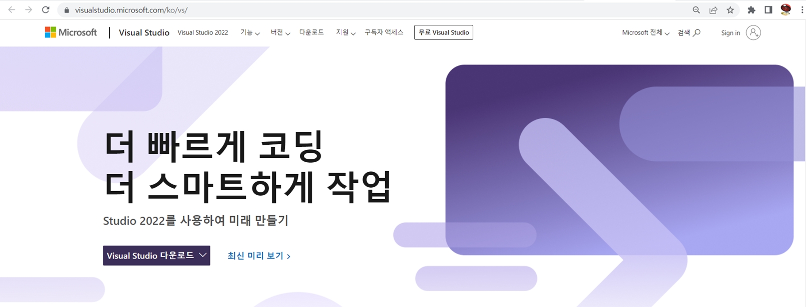 "Visual Studio 다운로드" 버튼을 누른 뒤, Visual Studio Community 2022 를 눌러 설치를 시작합니다.