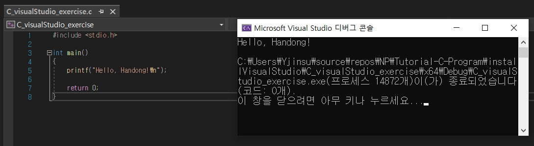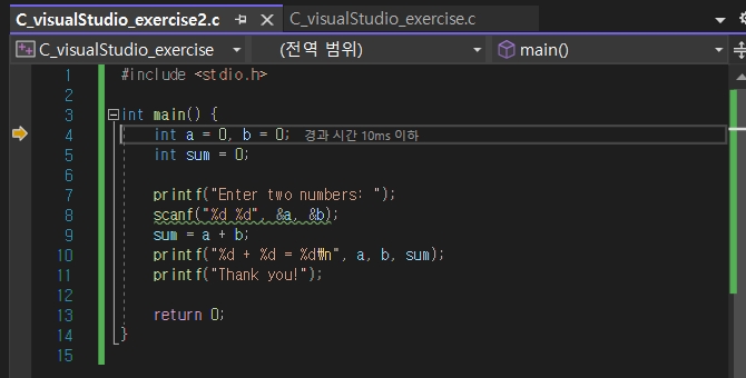 위에서 생성한 프로젝트 안에, C_visualStudio_exercise2.c 코드를 생성하고, 실행합니다.