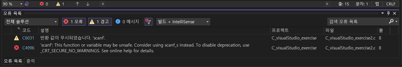 그런데, build를 하면 scanf 에서 오류가 나는 것을 확인할 수 있습니다. 노란색 경고의 경우 단순히 버려지는 값이 있음을 알리기 위해 인텔리센스가 안내하는 내용입니다. 원하는 작업대로 정상 동작 한다면 무시해도 됩니다.