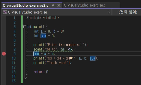 위 사진은 9번째 줄에 중단점을 설정한 상태입니다. 이 상태에서 F5를 눌러 디버깅을 시작하면, 설정한 중단점부터 디버깅을 시작합니다.