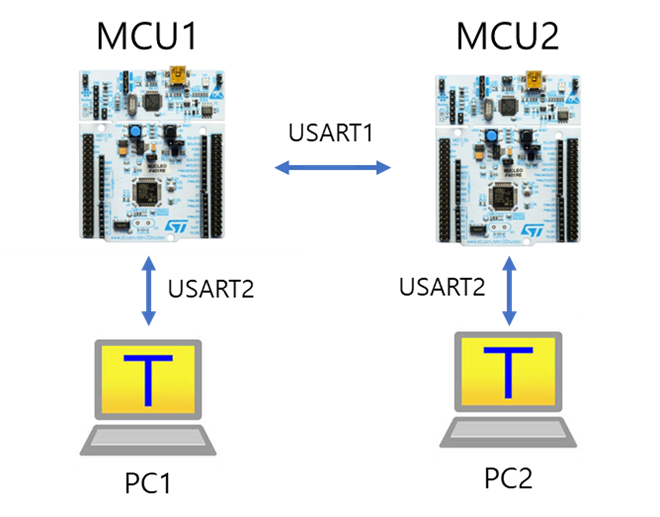 3. Connect each MCUs to each PC with USART 2 via USB cable (ST-Link)