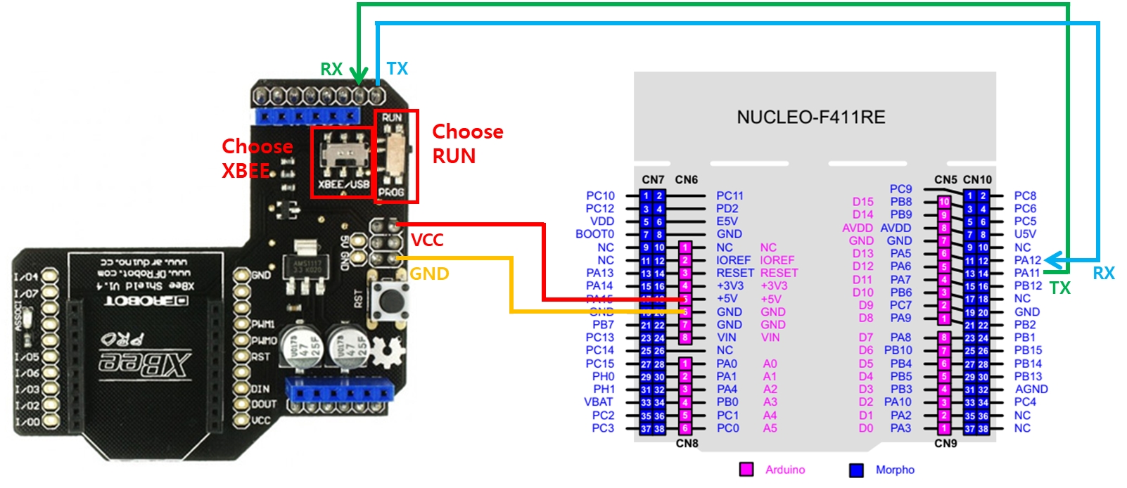 In order to communicate with Xbee through stm32 board, VCC, Ground, TX, RX must be connected from the xbee shield. In the case of STM32 f411RE board, USART2 is fixed to usb communication, so select between USART1 and USART6 and connect it to RX of the shield - TX of the board / TX of the shield - RX of the board.
