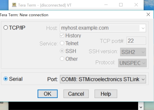 Choose ‘Serial’ tab -> Select ‘COMx: STMicroelectronics STLink’ port